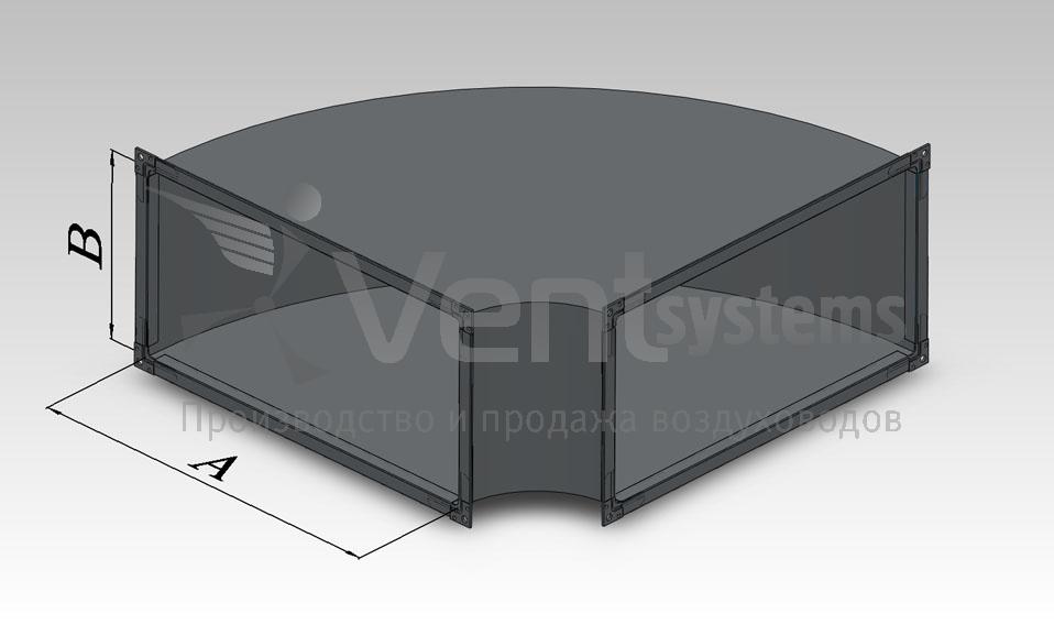 Отводы производятся из оцинкованной стали определенной толщины. Прямоугольное изделие собирается из четырех основных элементов: двух боковых стенок, а также внешней и внутренней сторон. На края отвода устанавливаются фланцы. Стандартные варианты угла поворота включают значения от 15 до 90 градусов.